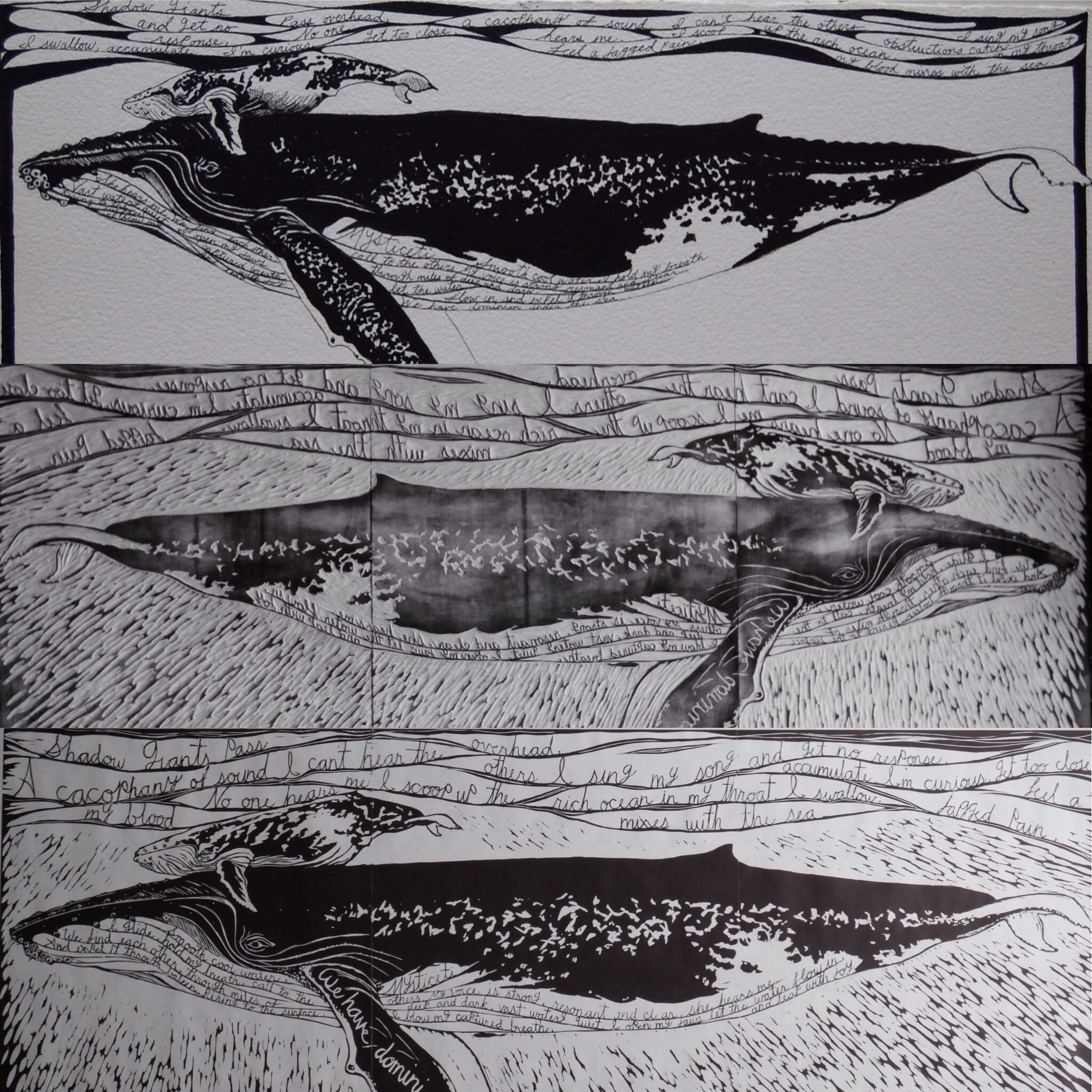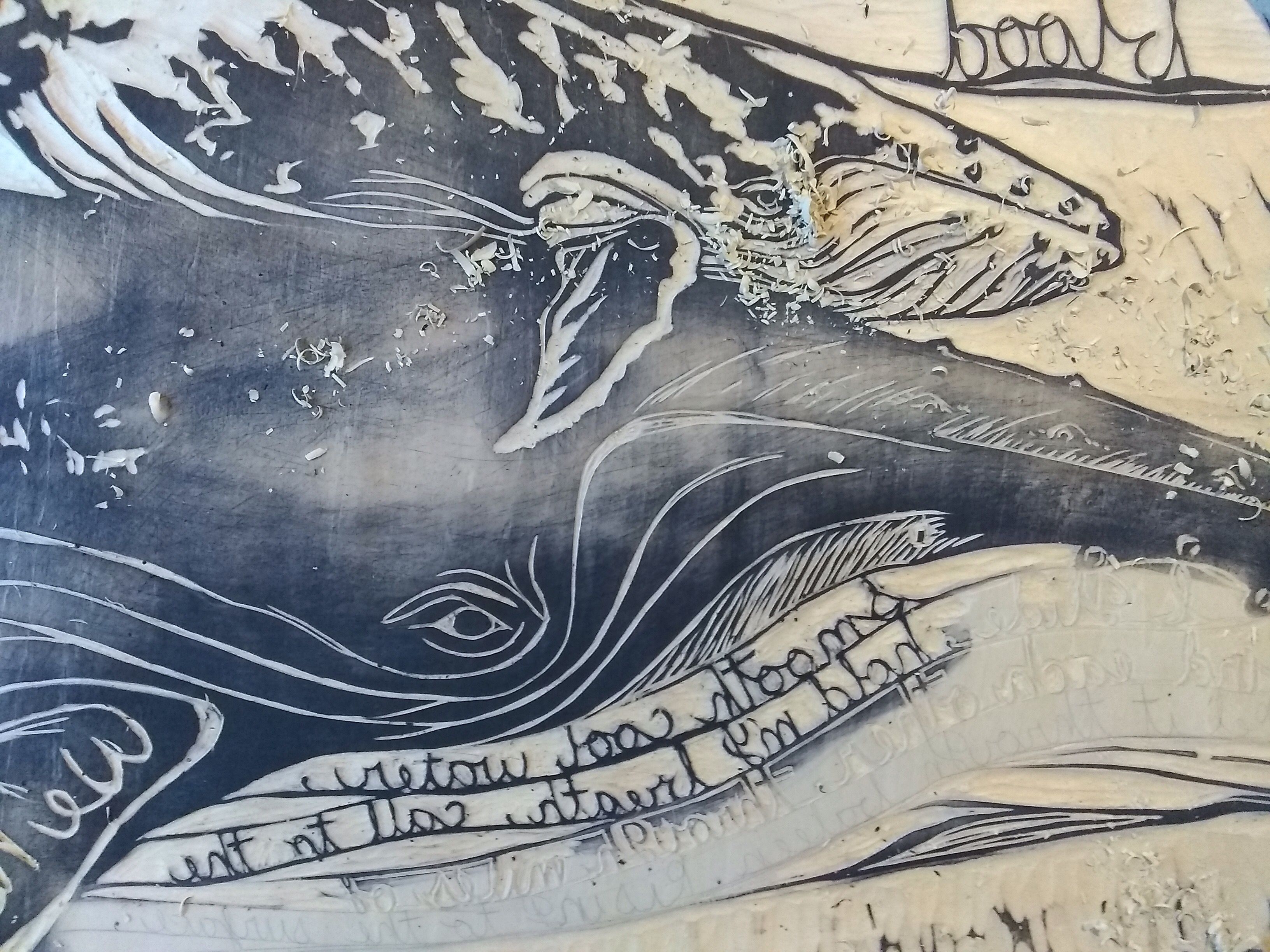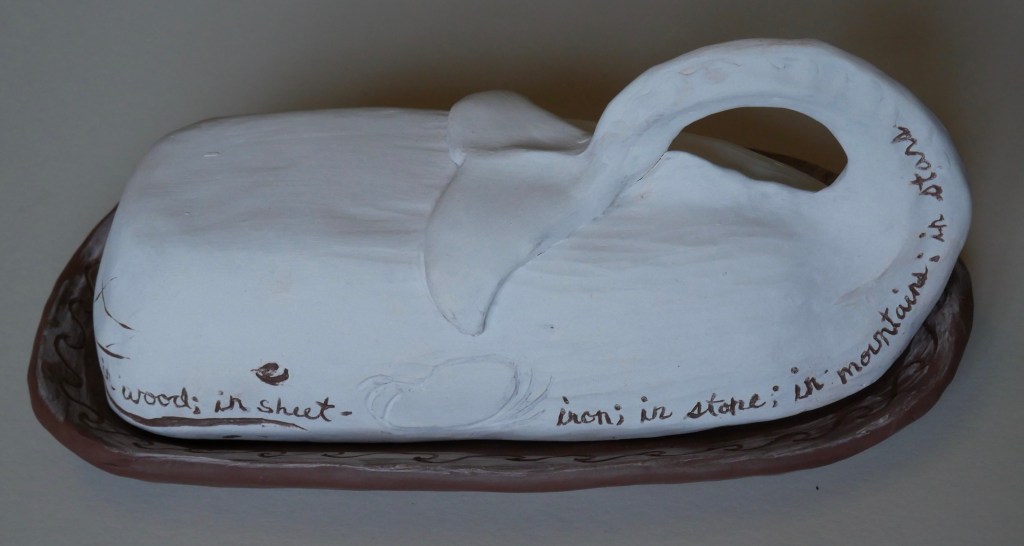 Sometimes you just have to make what you have to make and this sperm whale butter dish happened. I approach ceramics from the perspective of a printmaker and I love the sgraffito effect. It is similar to carving print blocks and I think the contrast between the dark clay and the white underglaze is beautiful. Although the Pot Shop in Evanston has re-opened, I hope to continue building some pieces from home using this beautiful clay!