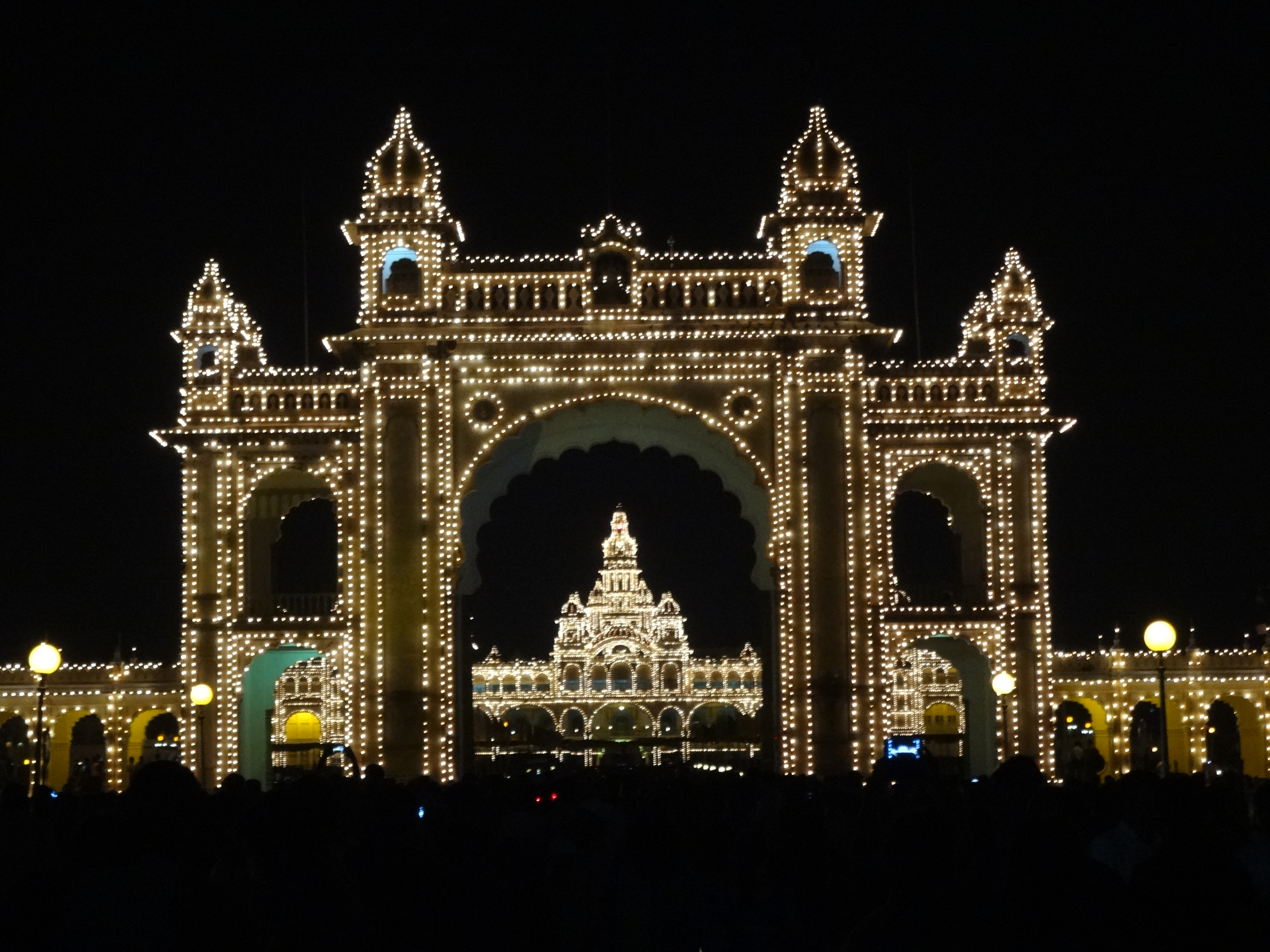 The spectacle of Dasara in Mysore was as far as we could get from our experience in Gudalur, but this is where we went next. On Friday evening we joined the throng at the palace to see the display of lights. Traffic was stopped so we got out of the car and walked along two sides of the block before meeting up with our car again. The excitement was palpable, and Ashwin skipped and danced down the sidewalk until it became too crowded and we had to hold on to keep him from getting lost. Much of Mysore was lit up, like Christmas or New Year’s Eve at home, with colored lights draped over every important building in the city. Roads had lights strung across them, and colored lights formed pictures of gods in motion. The palace was completely outlined in white lights. It was spectacular!
