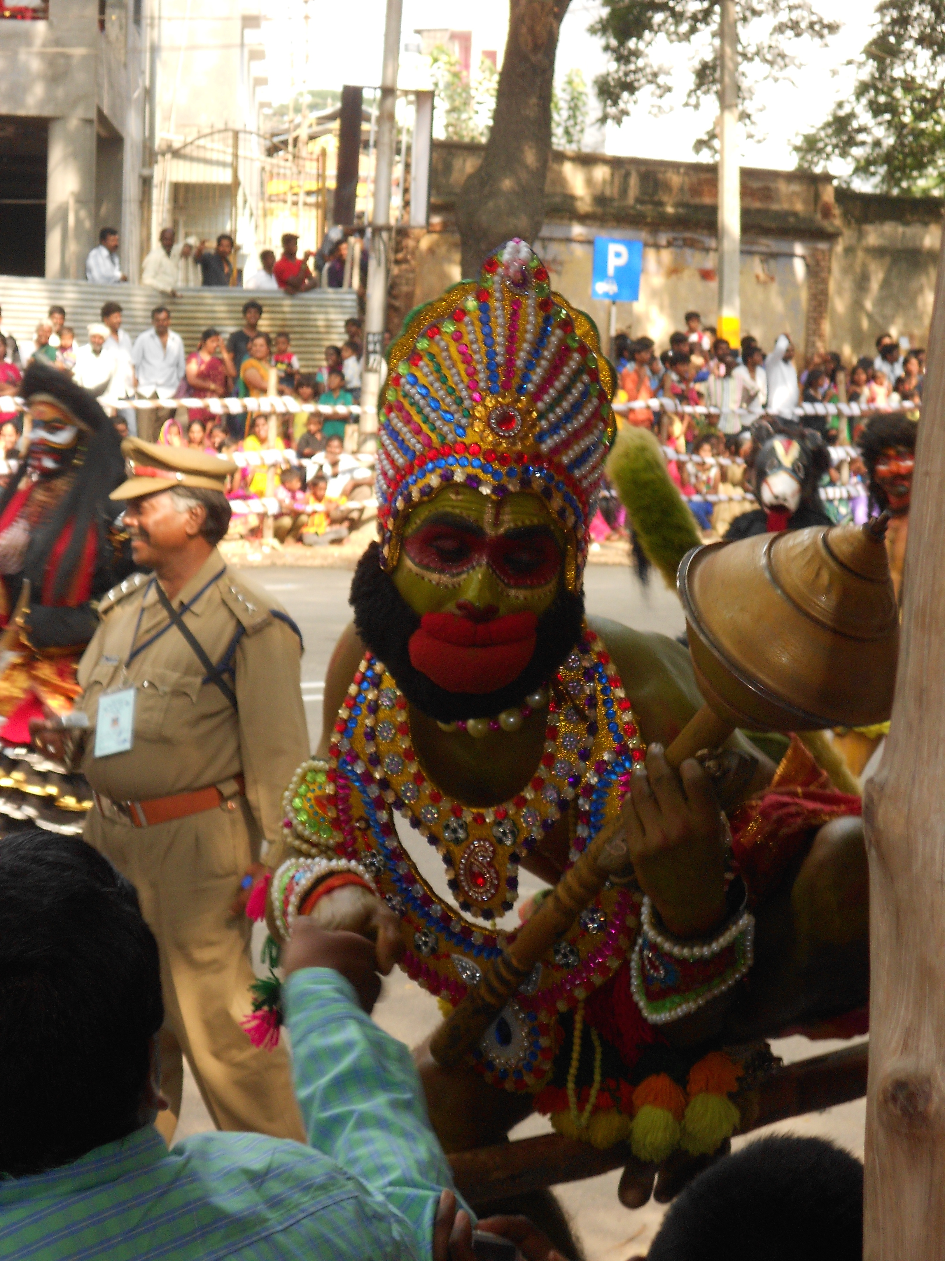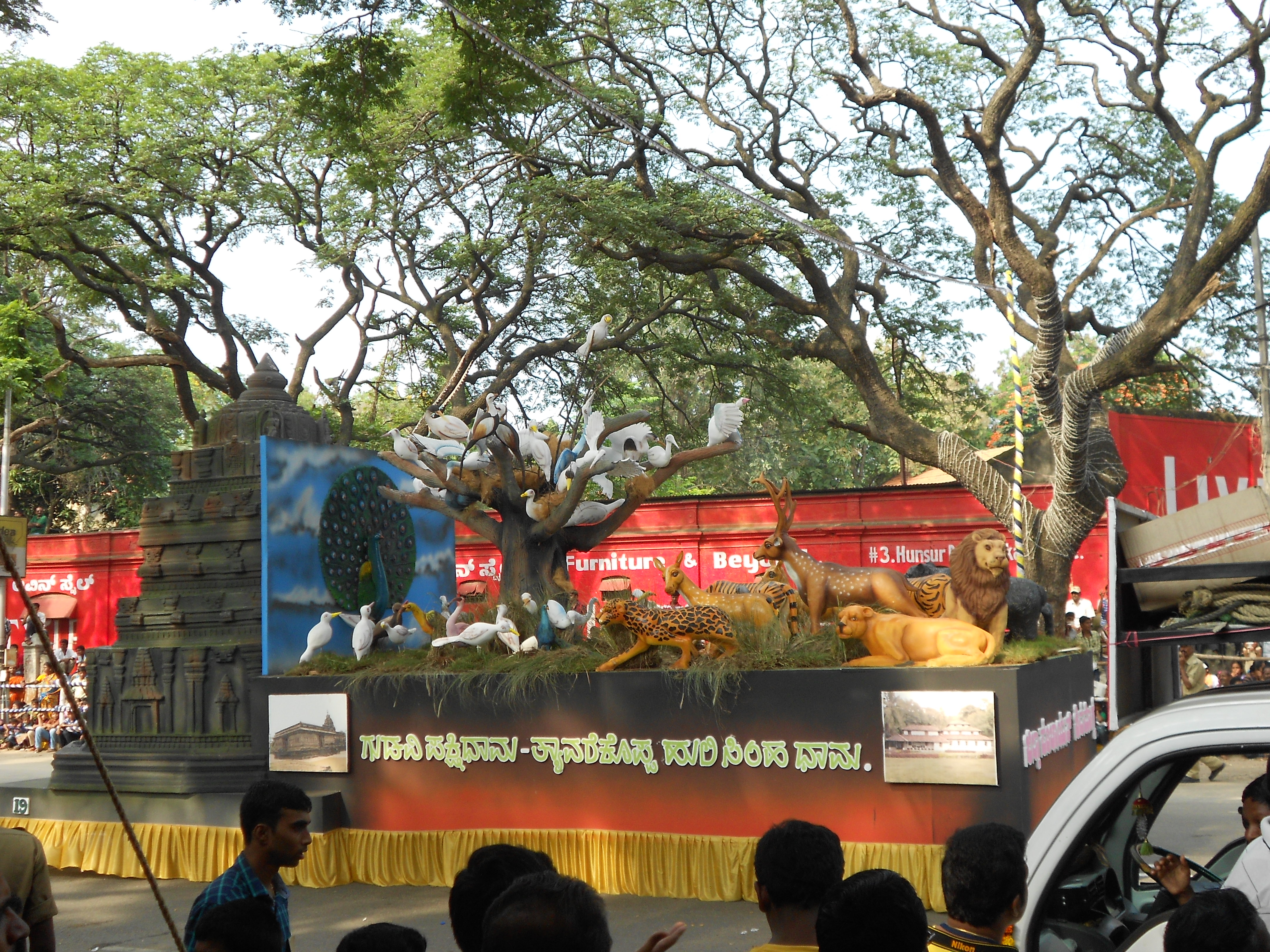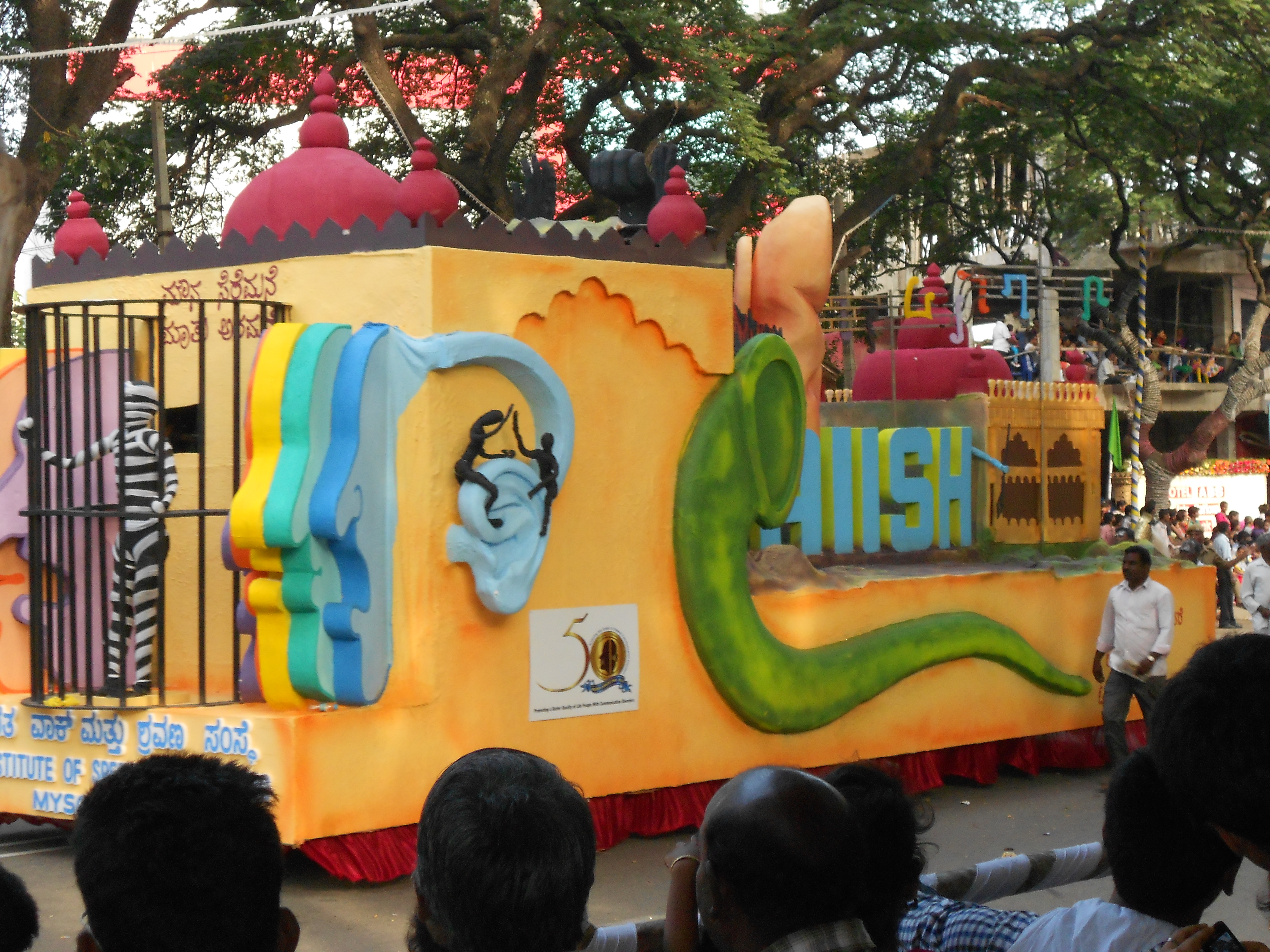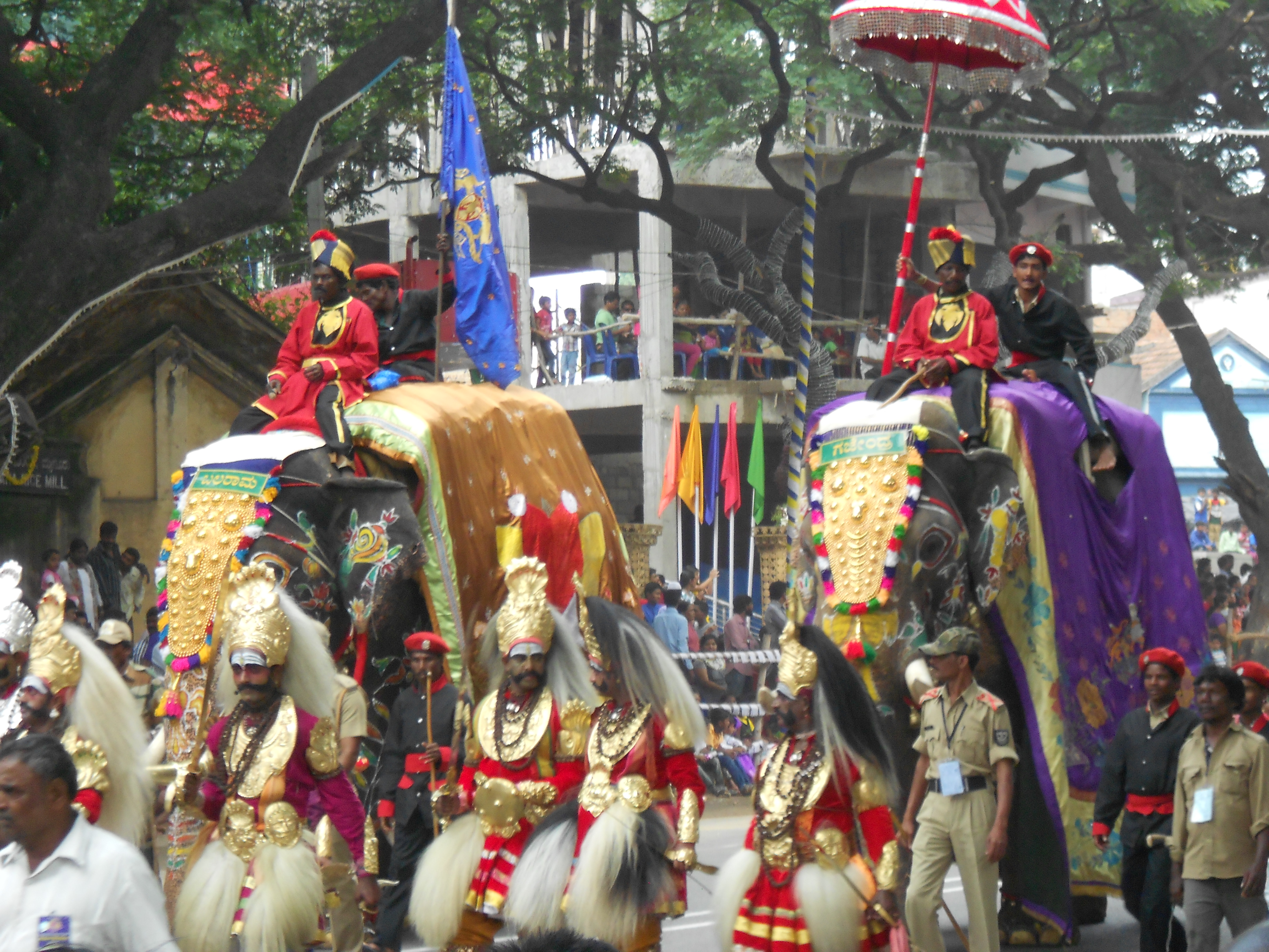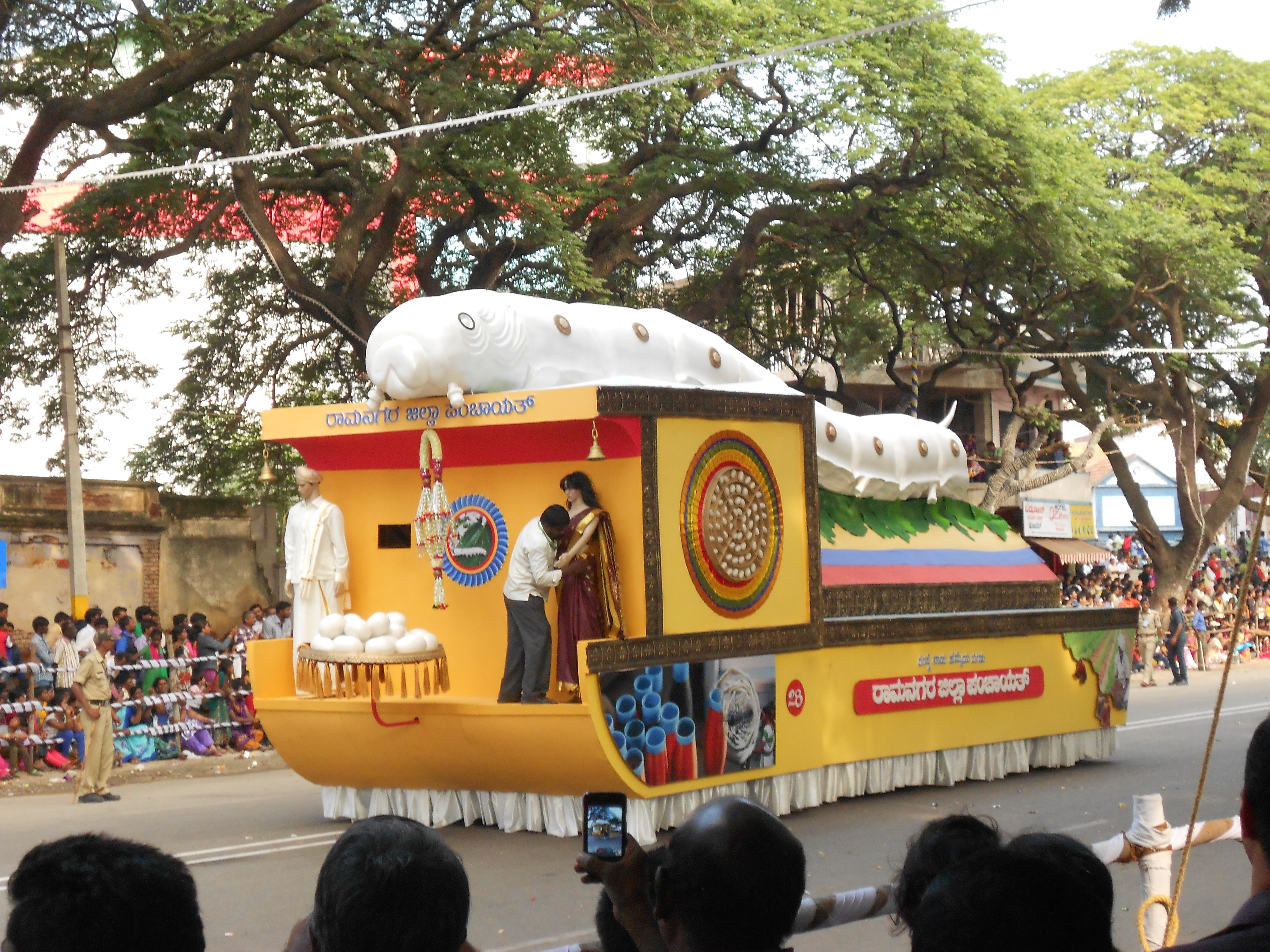 On the following day, Kamala and Anil Kumar made arrangements for us to watch the elephant procession, the Jamboo Savari. We had a comfortable place to sit in a storefront until the parade started, then we were taken to the front row and given seats on a platform with a perfect view. Included in the parade were 45 floats (or tableaux) with 71 costumed folk art troupes in between, drumming and dancing. The performers were hypnotic (Ashwin didn’t make a peep for two hours) and the tableaux were the height of kitsch. My personal favorite was the one with the giant silk worm on it (the man is trying to adjust the mannequin’s falling sari). There were many paper mache copies of temples, a giant ear, political figures, village houses, handicrafts, and tons of gods and animals. Two floats included a tiger attacking a man and another announced all of the repercussions one will suffer from going to the bathroom outside (including being attacked by a tiger and other monstrosities). In other words, this was by far the BEST parade I have ever seen in my life.