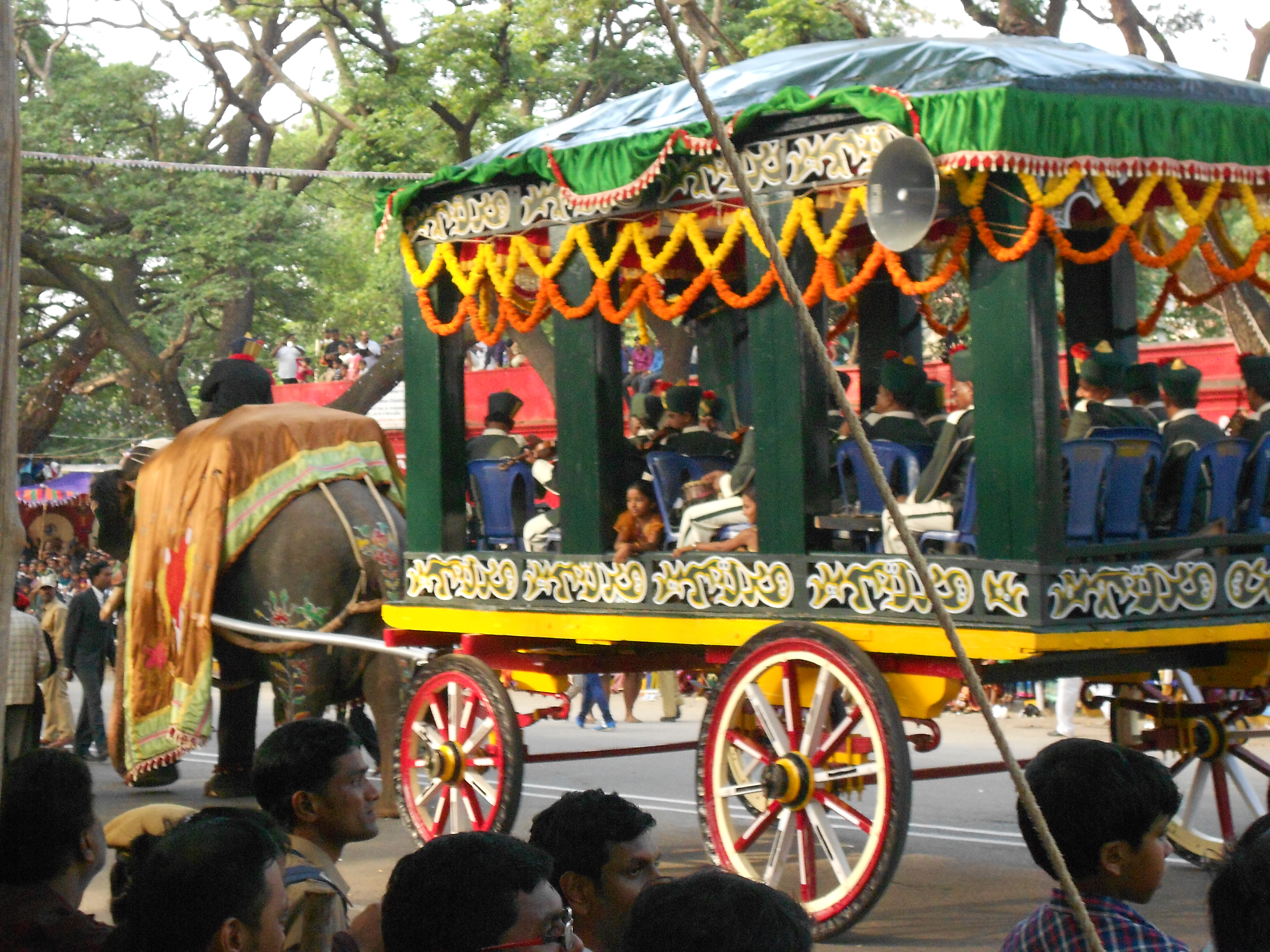 Did I forget the mention the Golden Howdah? The highlight of the Jamboo Savari are the elephants at the end, including the large central elephant carrying the Golden Howdah. This year the caparisoned elephant was Arjuna, carrying the 75 kg (or almost 200lb) solid gold Howdah bearing the idol of Goddess Chamundeshwari. Originally it was used to carry the Maharaja of Mysore. Notice the armed guards surrounding it? Don’t ask me how anyone could manage to steal it in this setting. Maybe by helicopter?