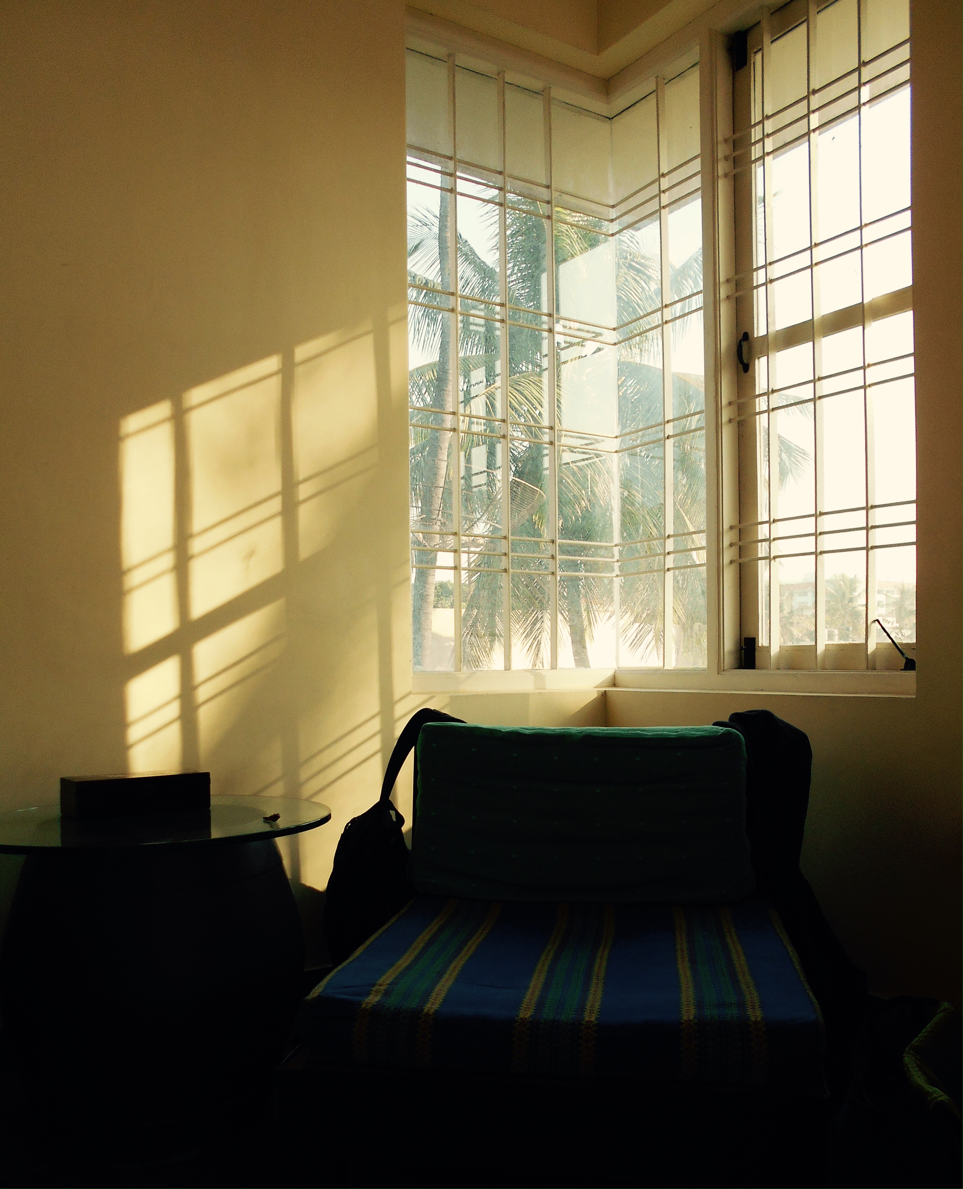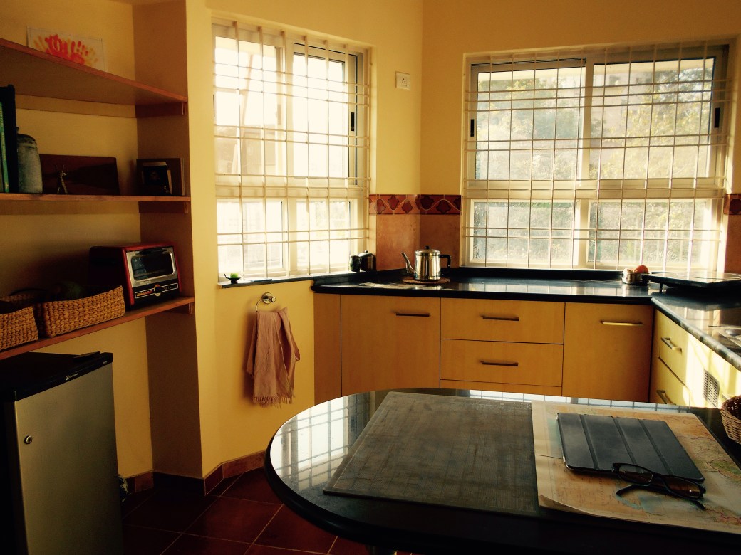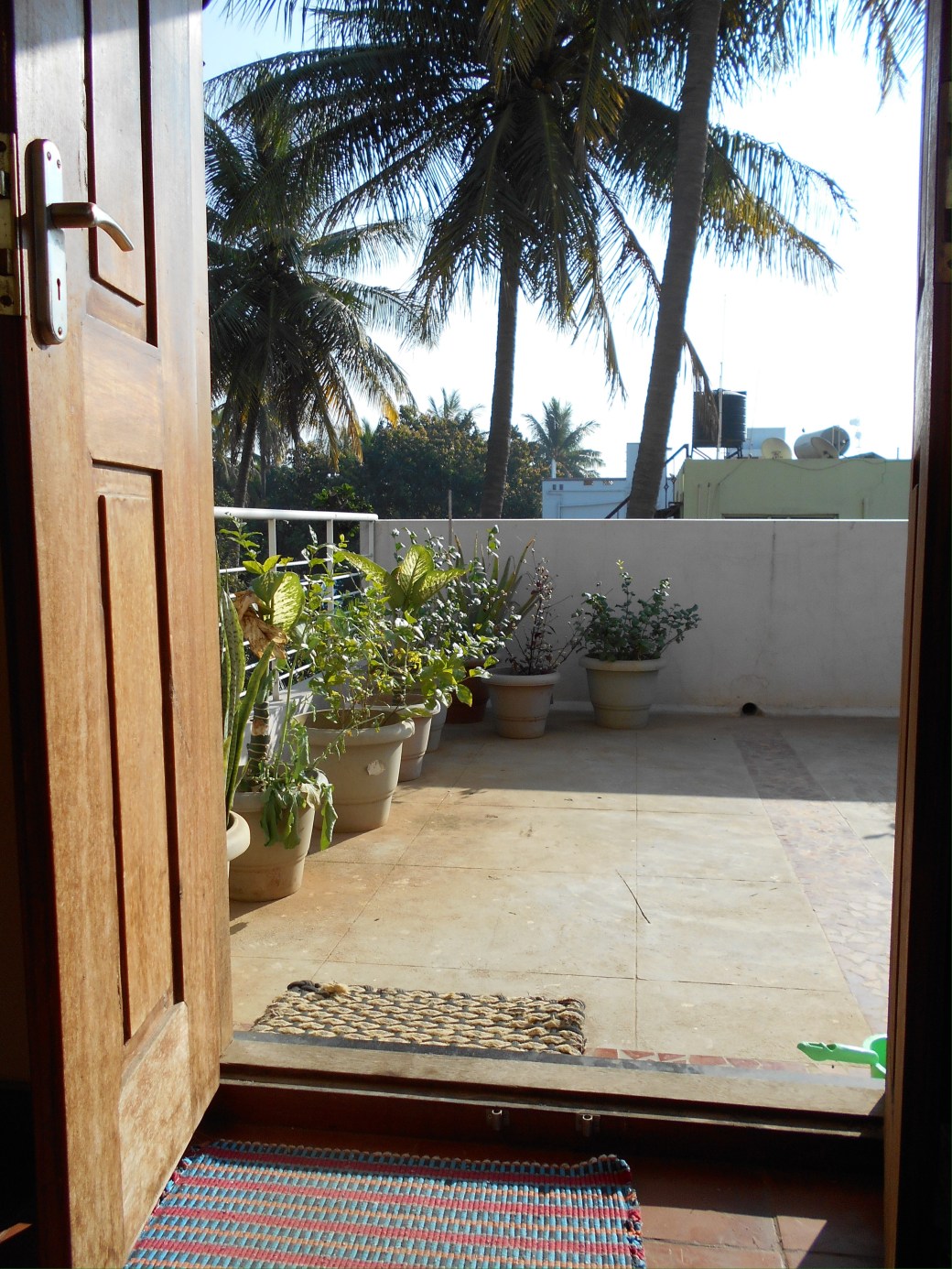 Outside our door the terrace is warm and full of potted plants. The cuckoo bird calls and there are parakeets and kites flying overhead.