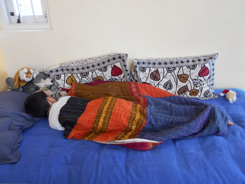 I sleep surrounded by colorful hand woven and printed fabrics.