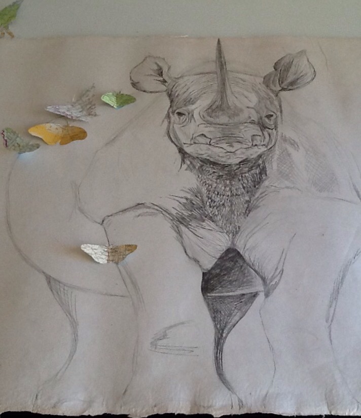 After reading about rhinoceros and the horn trade I decided I had to make a new drawing for my animal series on Indian handmade paper. I have been cutting butterflies from atlas paper also and trying to figure out what I want to do with them.