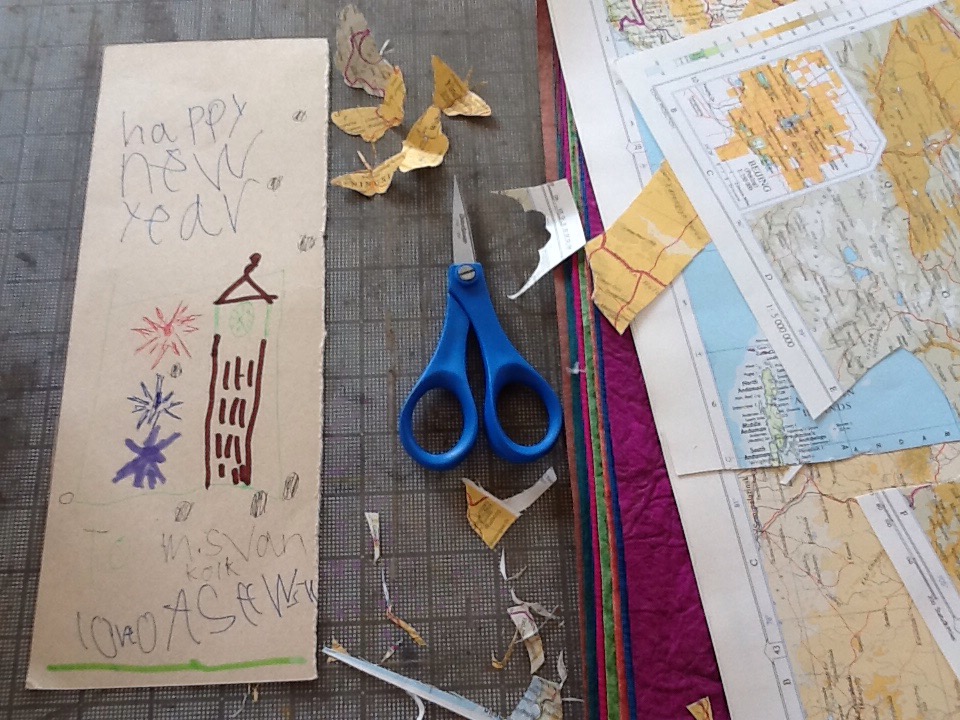 Like the birds that feed off the rhinoceros, I began placing butterflies on the rhino’s back. I decided to cut a flock of smaller butterflies from the Asian maps, as China and Malaysia are the main markets for rhino horns. So I’m back in my Cloud House Studio cutting butterflies.