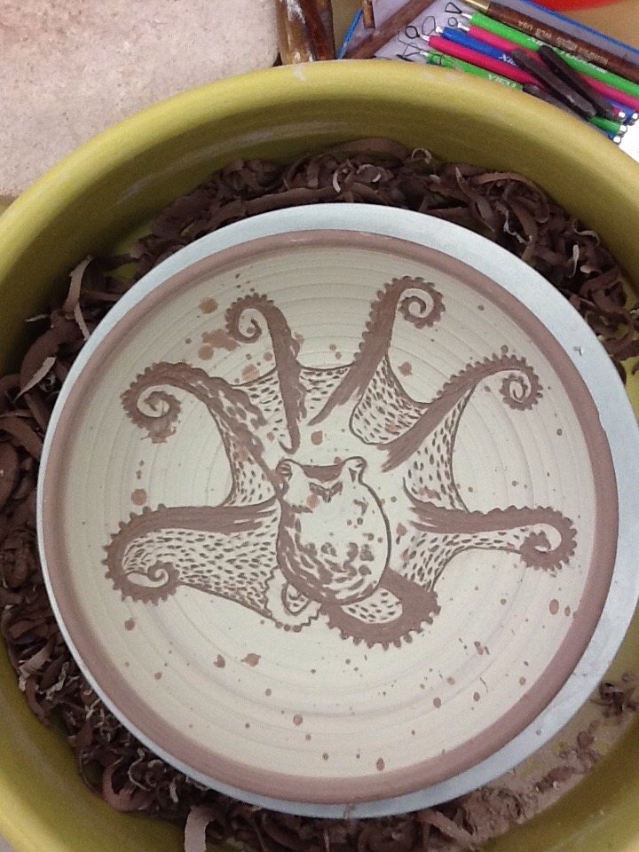 The bright colored tools come in many shapes and sizes. This shows the octopus in progress, before firing. I’m much happier with this one. I’m hoping to do a lot more work like this as my skills improve. For now I’m just experimenting but I will be keeping the glaze very simple on this one. Perhaps just transparent white.