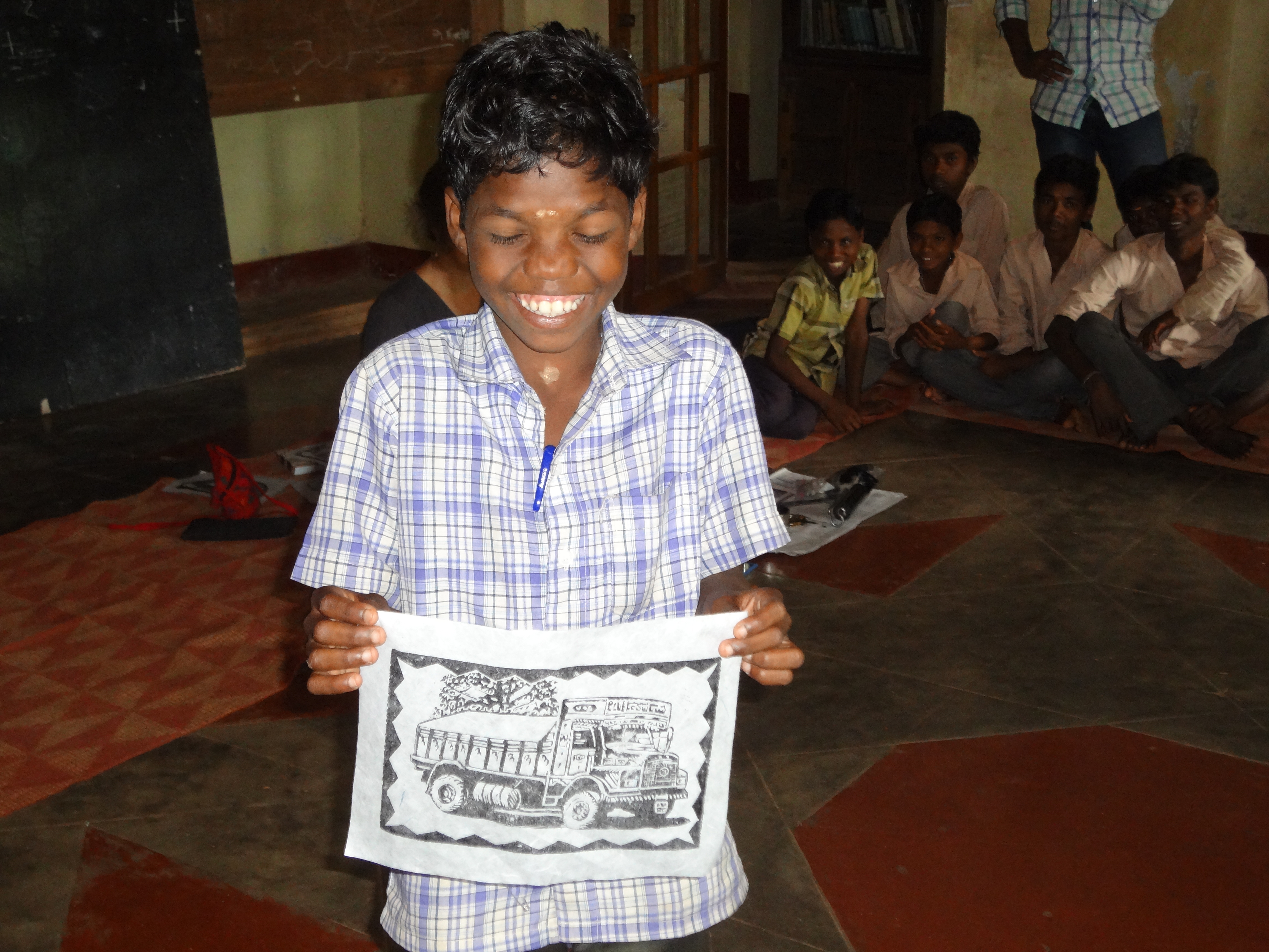 Vidyodaya School is an amazing place, set up to educate children from the Adivasi Tribe who live in the forest near Gudalur. I was asked by APU if I would make a presentation to the school kids, so I read my book ‘Sound Horn Okay’ to them while a school teacher translated explanations of each page. I think it was a bit of a flop as these kids come from the forest and haven’t been exposed to all the various forms of wheeled transportation. But then I demonstrated the block printing technique by inking a block with a carving of an auto rickshaw and laying a sheet of paper over it. When I peeled back the paper for the first print there was an excited gasp. They loved it! I encouraged them to come up and press the paper onto the block with the baren and help me peel the print. They were so happy to touch the materials and to see the results. It was a fantastic experience for me and I think for them also. One young man wanted to try inking and printing one on his own and asked me to teach him how to make prints. I had to leave after the demo, but I spoke to him for a while about various prints that can be made simply. I have also been asked to come back for a one day workshop, so I will try to fit it in during this trip to India. I would love to go back – these kids are so well behaved and so genuinely curious. It was a joy to meet them and talk to them.