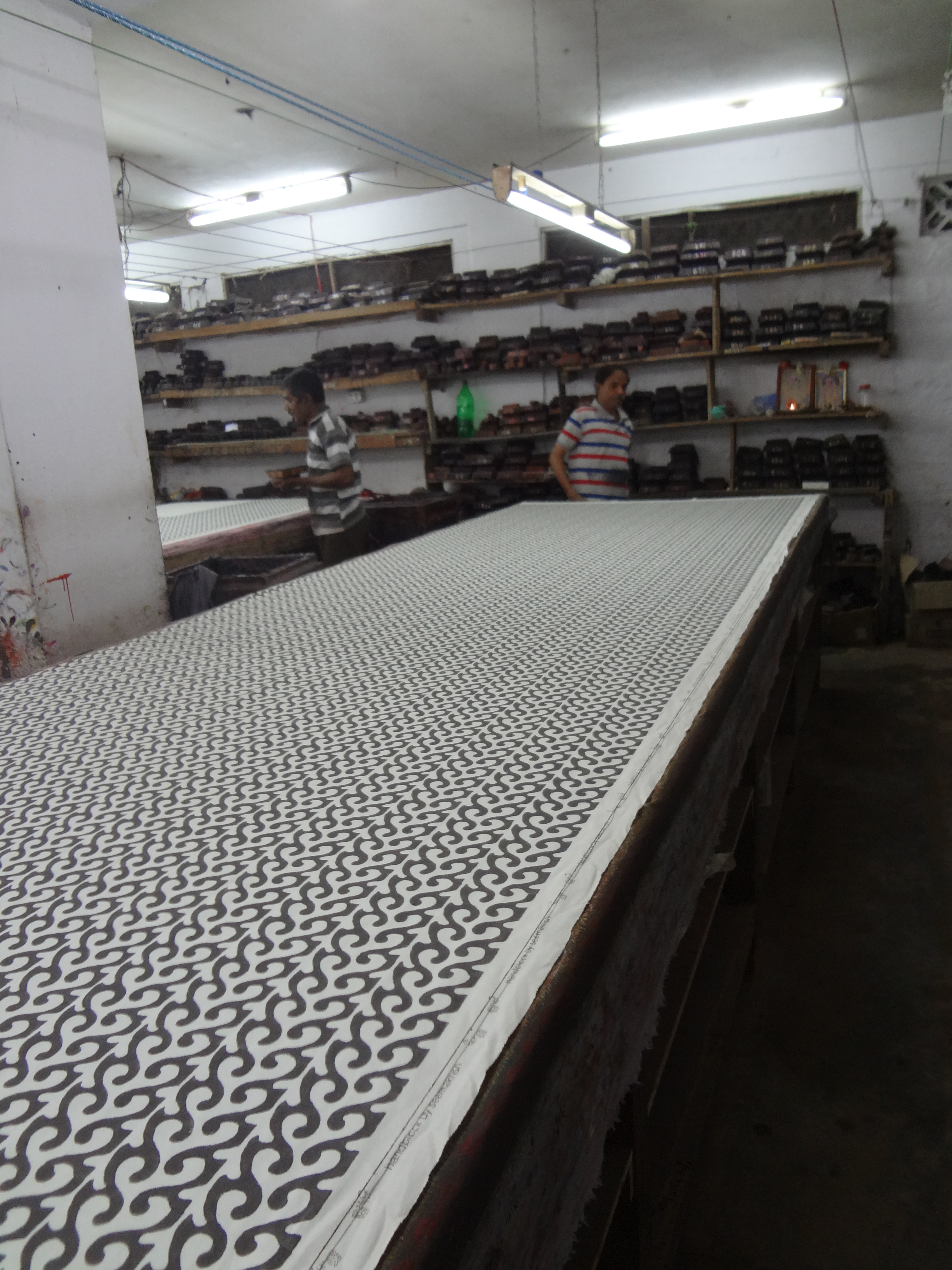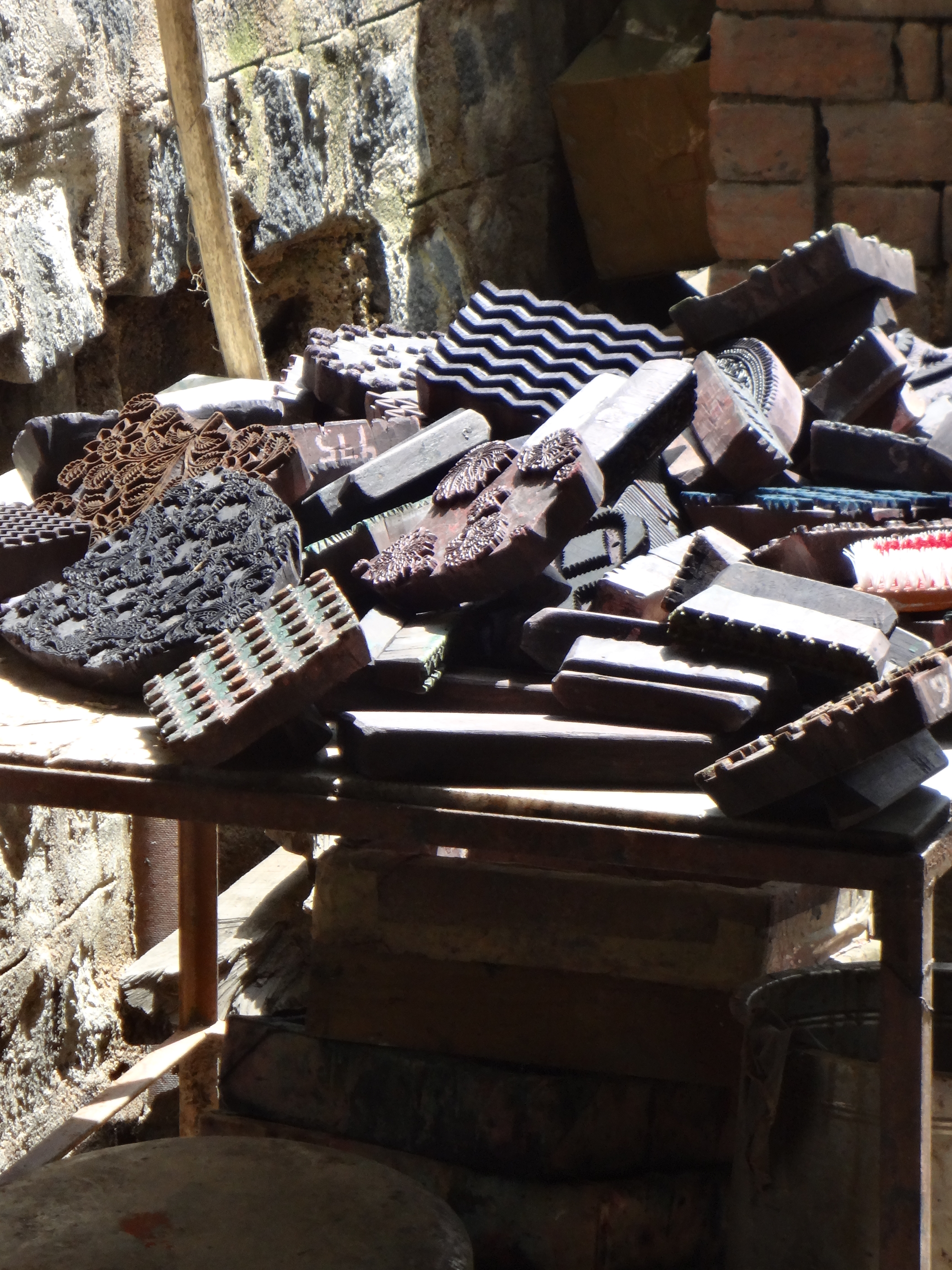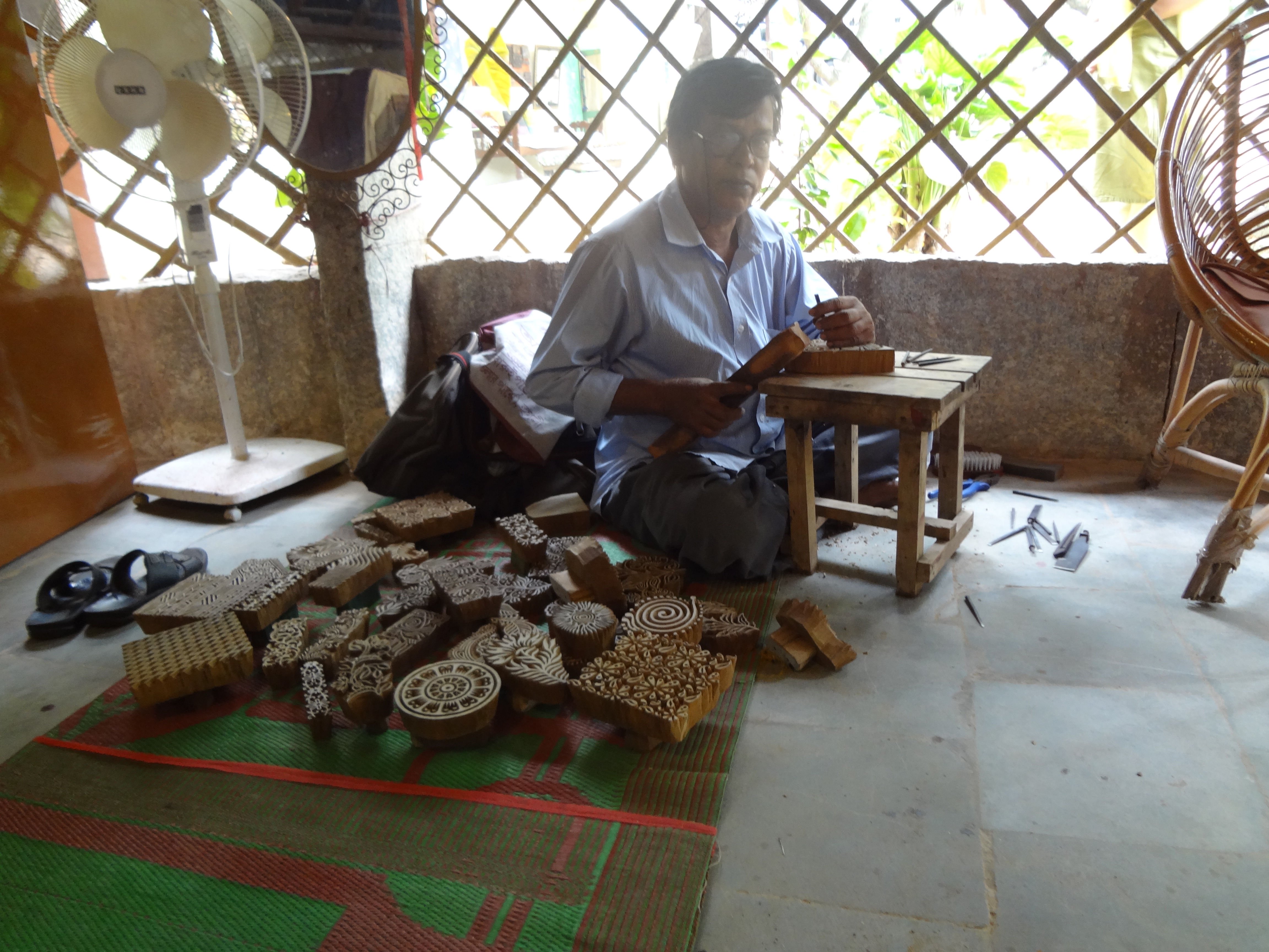 For me one of the greatest highlights was seeing the teak wood blocks being carved. The artisan had his small chisels custom made in Calcutta. I love how he lightly outlines the pattern first, then carves with chisels and mallet to get a deep relief carving. Teak is a very hard and durable wood. I’m in awe of this craft.