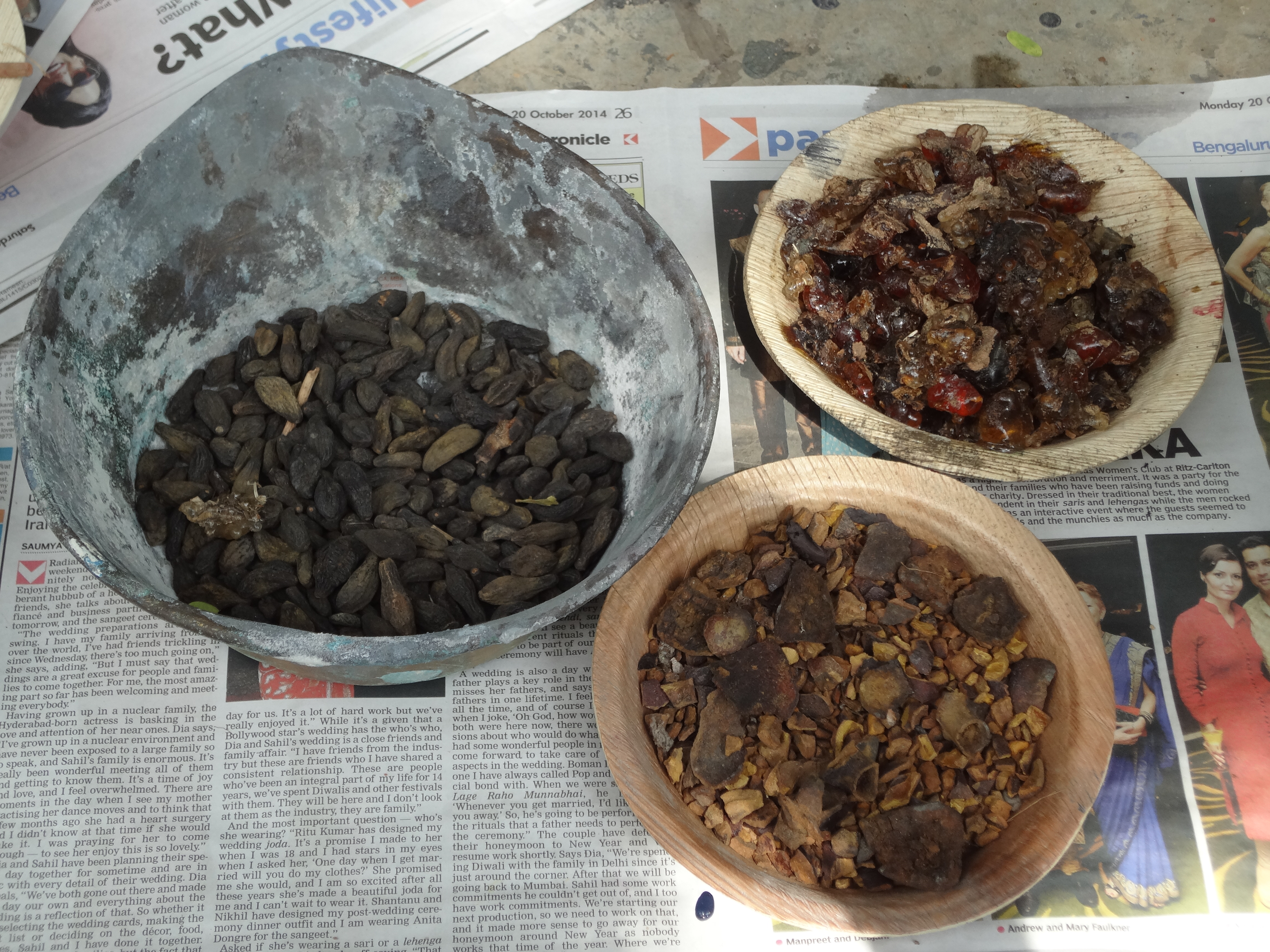 Gum Arabic on the upper right and pomegranate rinds on the bottom. The pomegranate makes a dull lime green color.